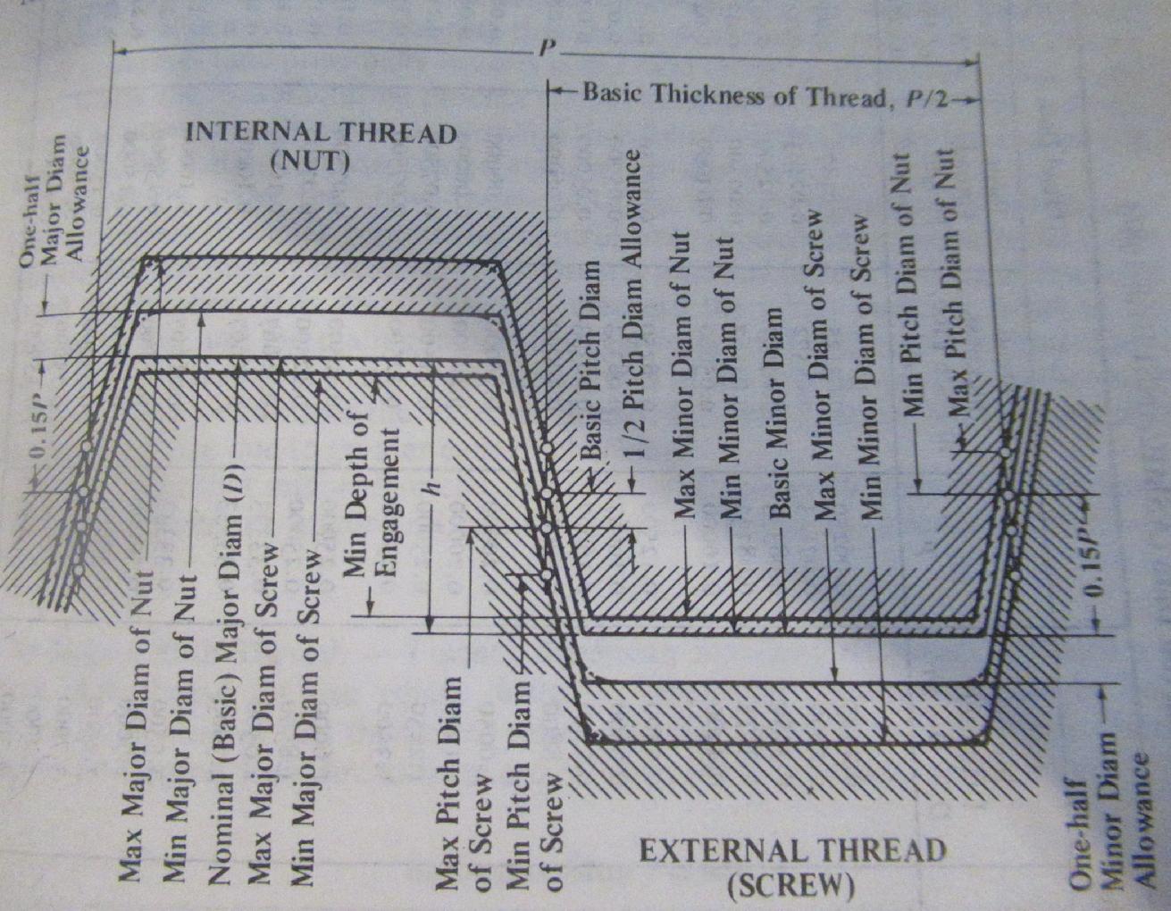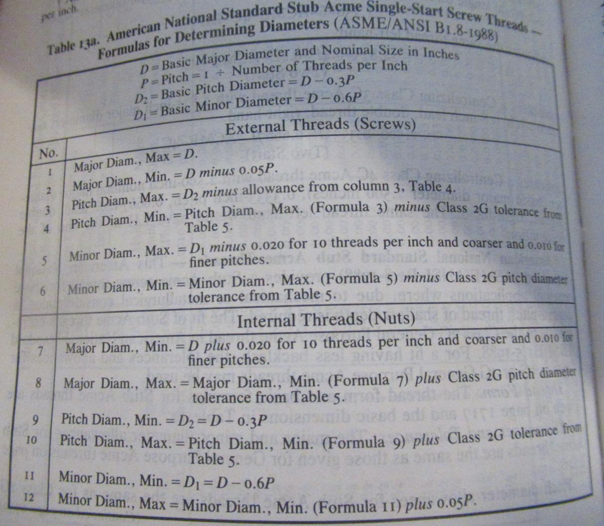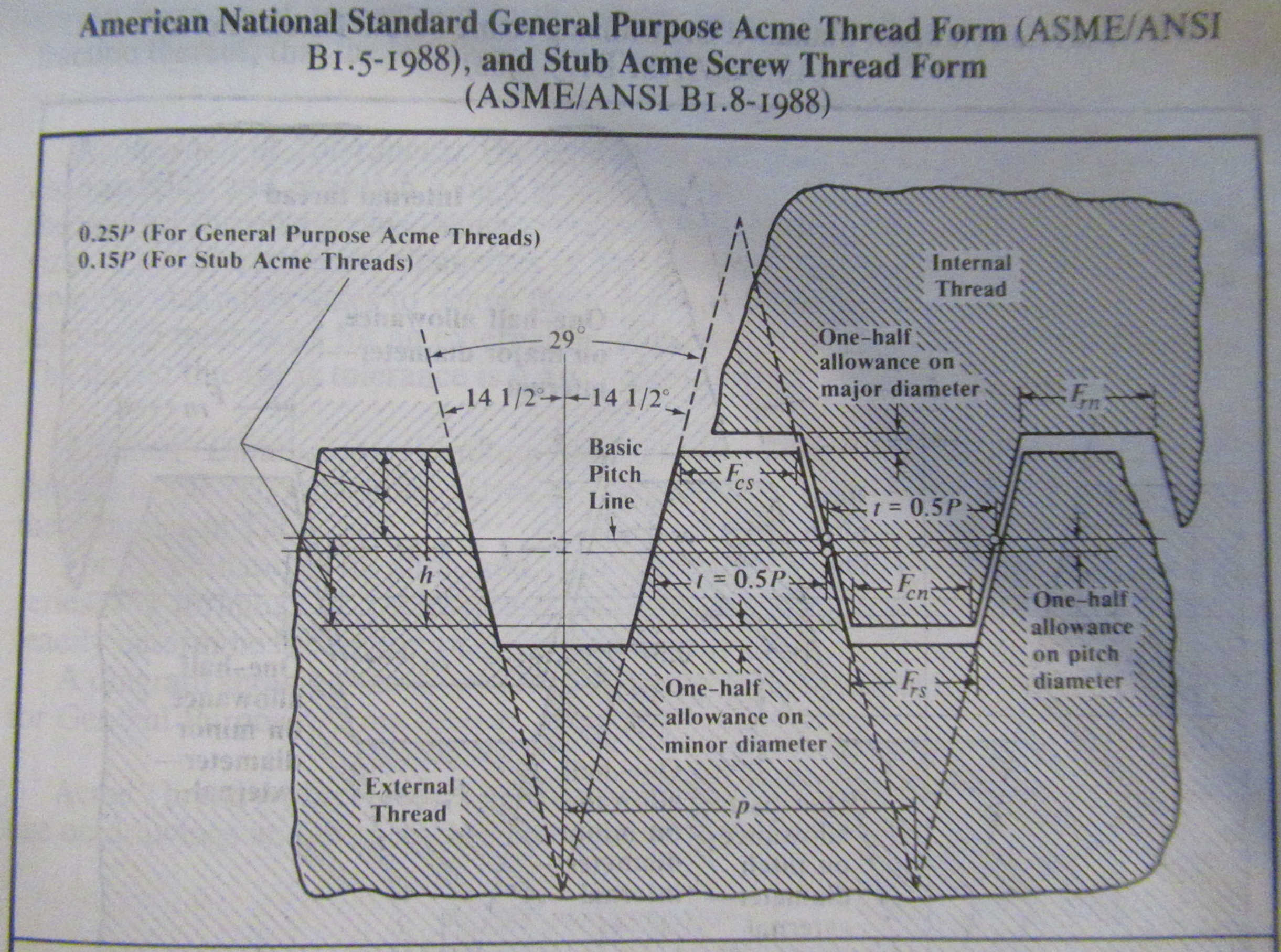 ANSI B1.8-1988 Stub Acme screw thread used in applications where due to a coarse-pitch thread of shallow depth is required. The fit corresponds to Class 2G general purpose acme thread in ANSI B1.5-1988. For a fit having less backlash, the tolerances and allowances for classes 3G and 4G may be used. The major and minor allowances for Stub Acme threads are the same as those given for general purpose acme threads.