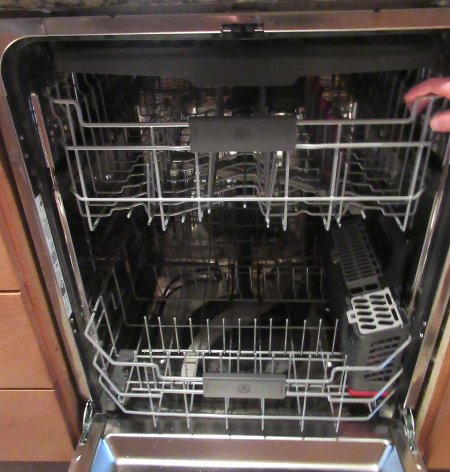 Date 2021-03-09: Same GE rep came in today. He found a stick in the air gap, 1.1" X 0.15" dia. The dishwasher appears to be functional. Now I know how important it is to keep the air gap clear, that is a lesson on me.