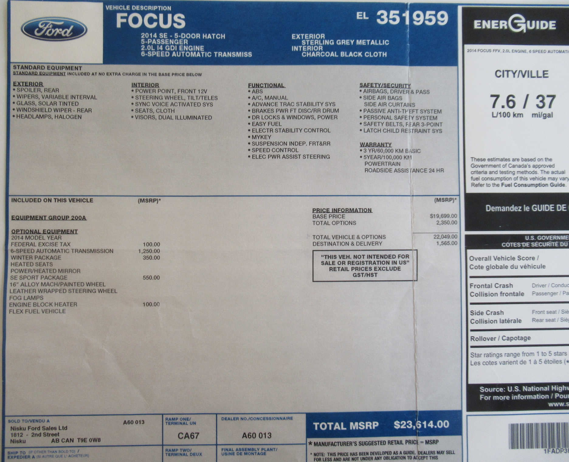 I chose a Ford Focus for an economy car. I liked the style of the 2014 Focus SE hatchback. The sale price including GST and extended warranty was $24,872 ($19,100 USD). I paid $2,135 for 5 years extended warranty which was far too much for what it was worth.