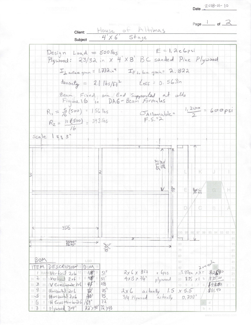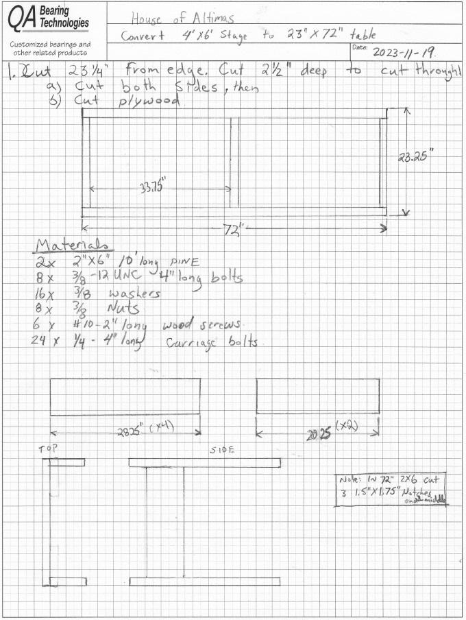 To convert a 4' x 6' karaoke stage into 2 stout tables. Table 1 72 in. Long 25 in. Wide 29 in. High 82 lbs Mass Capacity 500 lbs Other table will be similar but 23 inches wide Materials: Below is materials required per table Copyright © 2023 by Gregory Altimas