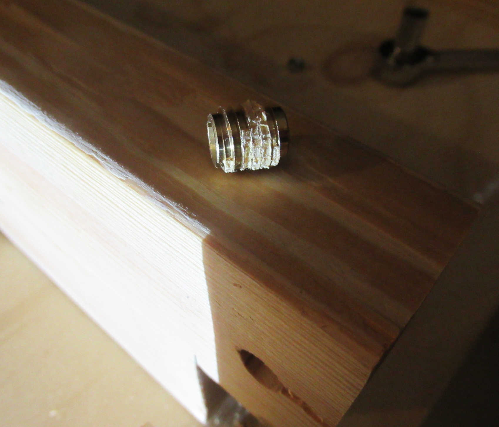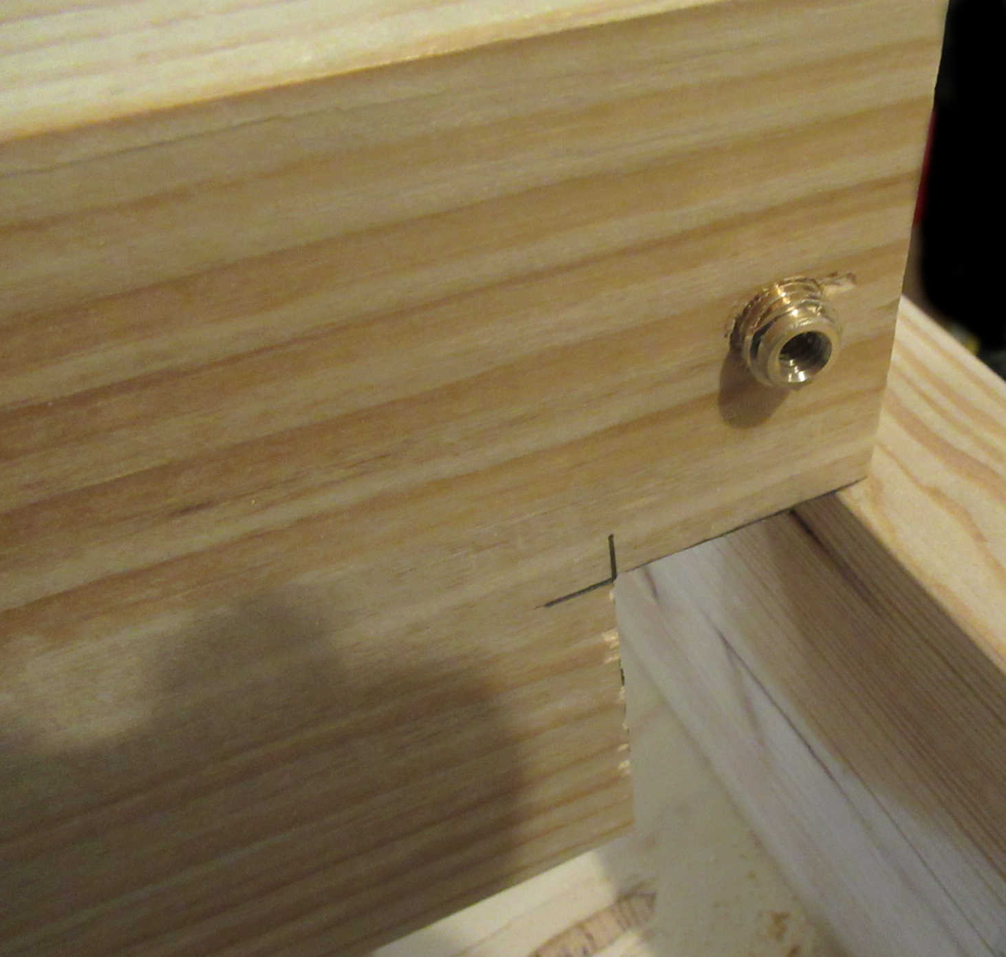 8. Drill two holes 3/8" hole, 0.5" depth, spaced 3.5" apart in the ends of each cross member. Then install E-Z Lok inserts.