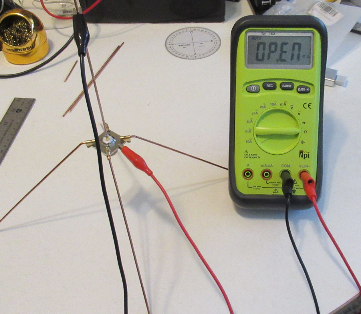 1. Cut out the length of the 1X radiating and 4X radial lengths. Straighten pieces, use a drill to twist wire, forward and reverse, to straighten if necessary. Gather the rest of the materials.